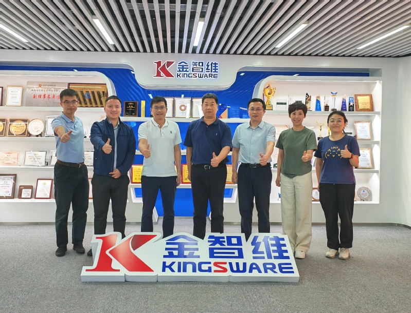 在廖萬里、金卓校友的陪同下,馬國進一行參觀了金智維公司的文化長廊與公司展廳,詳細了解企業(yè)運行情況、技術創(chuàng)新及市場布局。馬國進對企業(yè)的快速發(fā)展和創(chuàng)新能力給予了高度評價,并對校友們?nèi)〉玫淖吭匠删捅硎玖擞芍缘馁澷p。